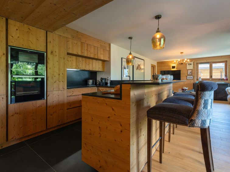 The comfortable living room features a large sofa and faux-fur armchairs, arranged around a fireplace and TV. The open kitchen is very well equipped, with a central counter and large dining table. This room opens onto a covered, furnished balcony, which can be heated in winter by a gas brazier.