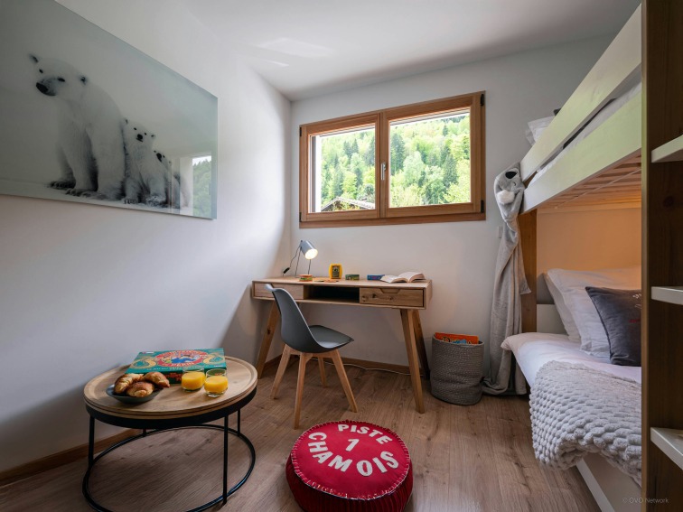 A children's bedroom with bunk beds and desk is also located on the first floor, along with a shower room with toilet.