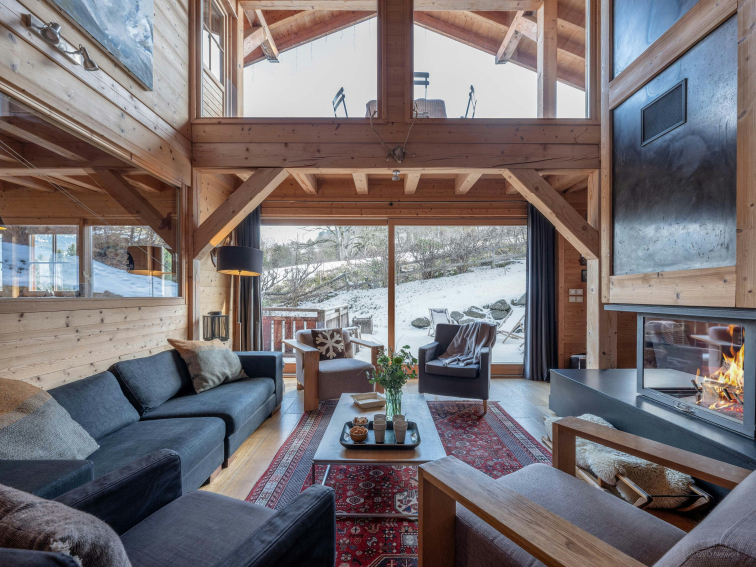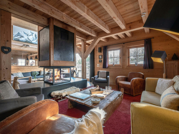 Surrounded by a large panoramic terrace, the luminous living room opens onto the mountains through high bay windows. Two lounges interact around a central fireplace, while the separate dining area features a spacious open kitchen and a large dining table that can bring the whole family together.