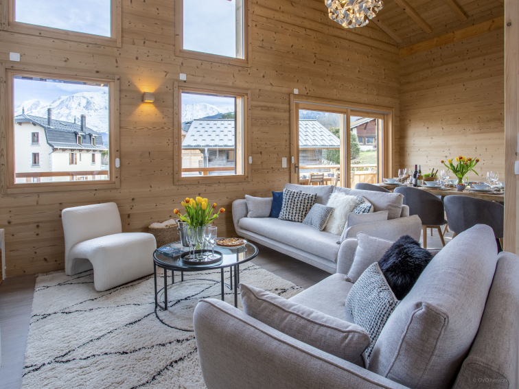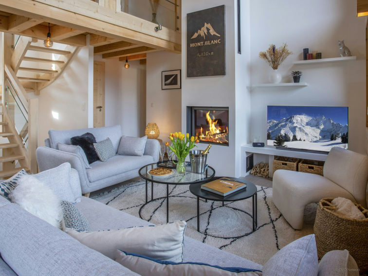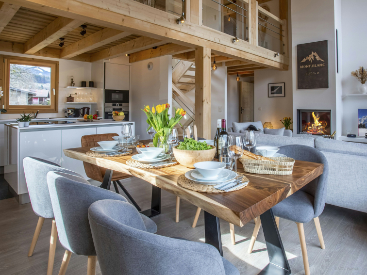 Le séjour ouvert est particulièrement accueillant, avec ses deux grands canapés confortables, disposés autour d’une cheminée et d’une télévision. Dans le même espace se trouvent une belle table à manger et une cuisine, compacte mais équipée de tout ce dont vous aurez besoin pour préparer vos repas. Toute la pièce est baignée de lumière naturelle grâce à des fenêtres sur deux niveaux et une grande porte-fenêtre qui ouvre sur le balcon.