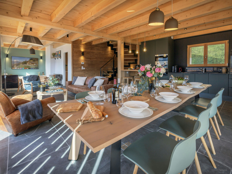 Au cœur du chalet rayonne une pièce de vie ouverte et spacieuse, qui inclut une cuisine, une table à manger, et un salon équipé de canapés confortables et d’une télévision. Sur le balcon adjacent, se trouvent une deuxième table à manger et un jacuzzi.