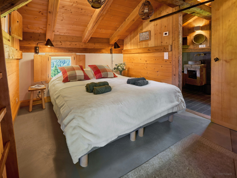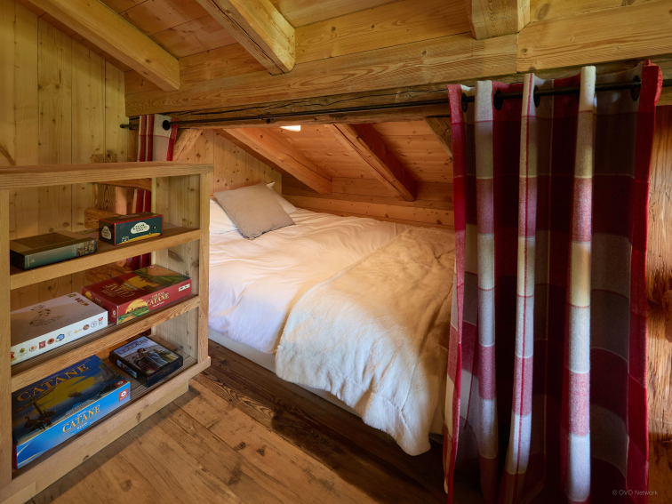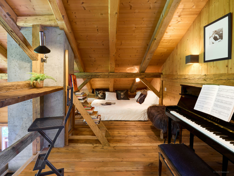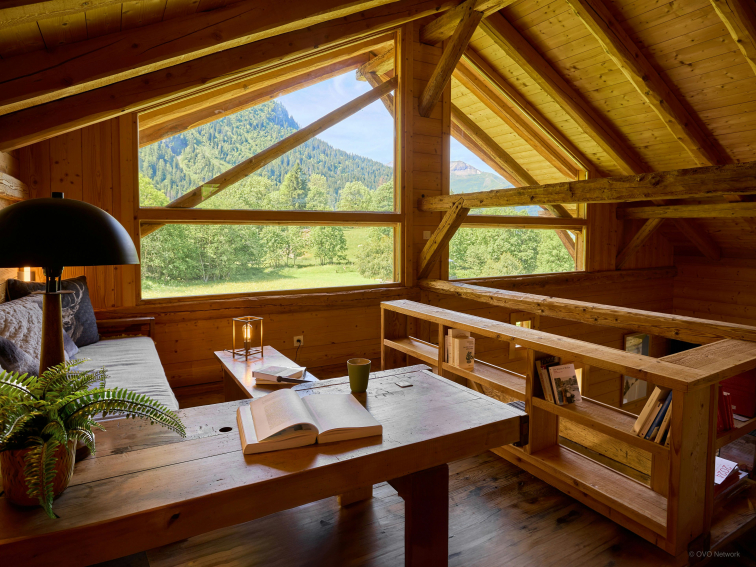 Avec un piano, des jeux de société et quatre bureaux donnant sur le mont Joly, la mezzanine sera le lieu de retrouvailles des adolescents et des télétravailleurs. Elle propose également un lit double, qui donne au chalet une capacité maximale de 12 personnes.