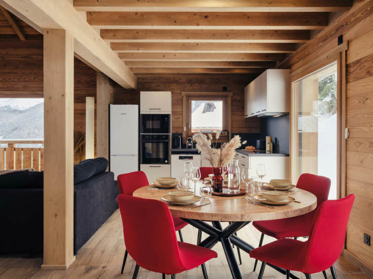 Le cœur du chalet est sa pièce de vie panoramique à l'étage central. Les baies vitrées enveloppent l’espace de lumière, un balcon file sur deux côtés et le poêle à bois réchauffera les soirées d’hiver.