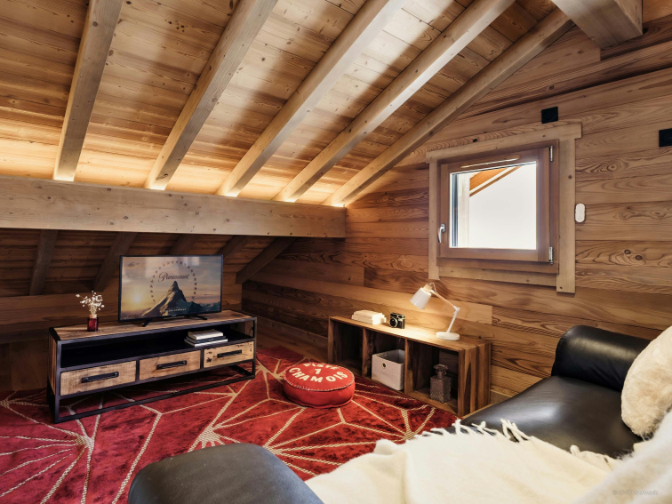 L’étage supérieur deviendra vite le repaire des enfants, avec une chambre nichée sous la charpente, une salle de télévision pour les temps calmes et un balcon pour admirer les montagnes.