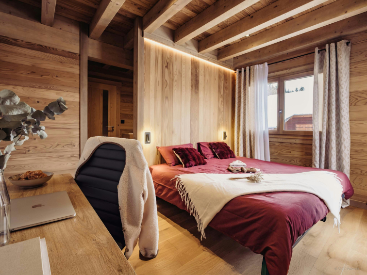 Les cinq chambres du Chalet Alpage du Bettex sont très confortables, en particulier la suite parentale au premier étage, avec son dressing, sa salle de douche privée, son bureau et son accès direct au balcon. Les autres chambres profitent également de belles ouvertures sur le paysage alpin.